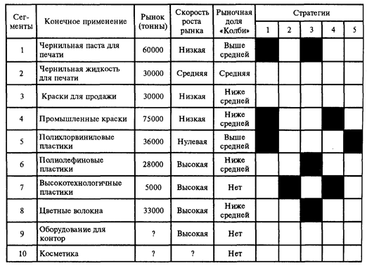 Суммарный рынок = 400 000 тонн. Рыночная доля корпорации «Колби» = 12,6%. Скорость роста рынка =2%. Стратегии:. 1. Модернизация завода и использование экономики масштабов для снижения себестоимости желтой краски. 2. Приобретение фондов конкурента. 3. Производственный и маркетинговый опыт на сегменте 1 использовать на сегментах 6 и 8. 4. Разработка новой химической основы для красящих пигментов. 5. Удержание позиции на рынке за счет дочерней компании до выпуска нового продукта. При определении направлений развития отдельных видов бизнеса в отделении красок, сегментированных по критерию конечного применения, использовалась различная маркетинговая информация, в том числе характеризующая емкость рынка, скорость его роста и рыночную долю конкретного вида бизнеса. Как видно, в силу отсутствия количественной информации при выборе стратегий может использоваться и чисто качественная информация. Рассмотрим сегмент №5 «Полихлорвиниловые пластики». Как следует из табл. 15.13, данный вид бизнеса на поле матрицы БГК относится к категории «дойных коров». Данная информация была принята в расчет при выборе двух стратегий: №1 и №5. Первая стратегия, ввиду отсутствия роста рынка, была направлена на разработку и выпуск нового продукта – желтой краски. Вторая стратегия, ввиду того, что данный вид бизнеса является еще достаточно доходным, была направлена на продолжение производства старого продукта на дочернем предприятии.