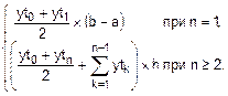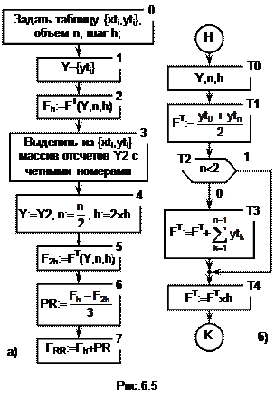 Fh= На рис.6.5 показан граф алгоритма для вычисления определенного интеграла от таблично заданной функции по формуле трапеций методом Рунге-Ромберга. Здесь рис. 6.5,а описывает сам метод Рунге-Ромберга, а рис. 6.5,б задает вычисления по формуле трапеций (6.8). В блоке 0 (рис. 6.5,а) задаем табличную функцию {xti,yti}, ее объем n и шаг h. В блоке 1 из всех отсчетов {yti} табличной функции образуют массив Y. В блоке 2 происходит обращение к формуле трапеций (рис.6.5,б) с данными Y, n, h. Результатом будет значение Fh определенного интеграла на шаге h. В блоке 3 из отсчетов табличной функции с четными номерами формируем массив Y2, в котором эти отсчеты табличной функции получают новую сплошную нумерацию 0, 1, 2,...,