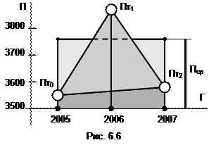 Действуем по рис.6.5,а, предварительно выполнив замену обозначений для операндов: xti, yti на Гтi и Птi, Y, Y2 на П и П2, соответственно 0. Таблица {Гтi,Птi} задана (табл. 6.2), объем n=2, шаг h=1. 1: П={3554.7, 3855.4, 3582.5}. 2: Fh= 3: П2={3554.7, 3582.5}. 4: Y=Y2, n=1, h=2. 5: F2h= 6: PR=95.6. 7: FRR=7519.6. Теперь вычислим среднее количество преступлений Пср за период DГ=2007-2005=2 года. Пср= На рис. 6.6 представлены исходные данные и результаты решения задачи. Cветлыми кружками отмечены отсчеты табличной функции Птi, черными точками на оси абсцисс – значения Гтi. На первом плане темной заливкой выделена трапеция площадью F2h. На втором плане более светлой заливкой показаны две трапеции общей площадью Fh (их нижние части не видны). На заднем плане виден самый светлый прямоугольник площадью FRR. Его высота равна искомой величине Пср, а основание DГ=2007-2005.