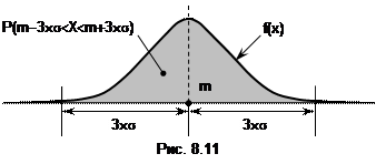P(m-3´s<X<m+3´s)=0.997@1. «Правило трех сигм» для нормального распределения с параметрами m и s иллюстрирует рис. 8.11. Заштрихованная площадь под кривой f(x) (вероятность попадания значений СВ X в диапазон от m-3´s до m+3´s), равна 0.997. Значит, событие (m-3´s<X<m+3´s) практически достоверное. А вероятность выхода ее значений за пределы этого диапазона равна незаштрихованной площади под кривой f(x) составляет 1-0.997=0.003. Значит, событие ù(m-3´s<X<m+3´s) практически невозможное.