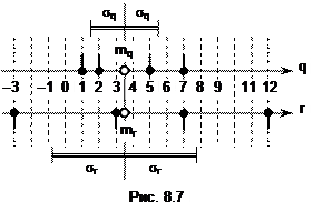 На рис. 8.7 показано размещение отсчетов случайных величин Q и R на числовой прямой. Сначала по формуле (8.11) вычисляем математические ожидания для случайных величин Q и R: mq=1´0.2+2´0.3+5´0.4+7´0.1=3.5 (см. рис. 8.7), mr=-3´0.2+3´0.5+7´0.2+12´0.1=3.5 (см. рис. 8.7). Как оказалось, Q и R имеют одинаковые средние: mq=mr=3.5. Но легко заметить (рис. 8.7), что отсчеты R относительно mr разбросаны сильнее, чем отсчеты Q относительно mq. По формулам (8.12) и (8.10) вычислим дисперсии и СКО для случайных величин Q и R: Dq=12´0.2+22´0.3+52´0.4+72´0.1-3.52=4.05, sq=2.01 (рис. 8.7), Dr=(-3)2´0.2+32´0.5+72´0.2+122´0.1-3.52=18.25, sr=4.27 (рис. 8.7).