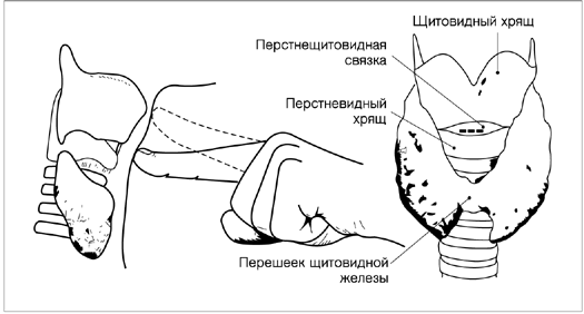 Коникотомия Коникотомия — вскрытие гортани путем рассечения перстнещитовидной связки. Операция безопасна и выполняется быстрее, чем трахеотомия. В экстренной ситуации коникотомия позволяет быстро обеспечить доступ воздуха к легким. Перстнещитовидная связка прощупывается между верхним краем перстневидного хряща и нижним краем щитовидного. Между кожей и просветом гортани здесь нет важных анатомических структур, которые можно повредить. Скальпель вводят поперечно (пунктирная линия на рисунке) и поворачивают его на 90° лезвием вниз, обеспечивая доступ воздуху.. Коникотомия является временным вмешательством, за которым следует немедленно после преодоления опасного состояния надлежащим образом выполненная верхняя трахеостомия. Пункционная коникотомия позволяет получить из трахеи и бронхов материал для посева. Больного укладывают на спину и запрокидывают голову. Обрабатывают шею антисептическим раствором. Надев стерильные перчатки, нащупывают перстнещитовидную связку и проводят инфильтрационную анестезию. Перстнещитовидную связку пунктируют сосудистым катетером (Angiocath 18 G). О попадании катетера в трахею свидетельствует поступление воздуха при отсасывании. Придерживая катетер, удаляют иглу и вводят в трахею 5—10 мл физиологического раствора (без бактериостатических добавок). Сразу же отсасывают содержимое. Полученный материал отправляют в лабораторию для бактериологического исследования (бактериоскопия мазка, окрашенного по Граму, и посев). Катетер удаляют, накладывают повязку из лейкопластыря.