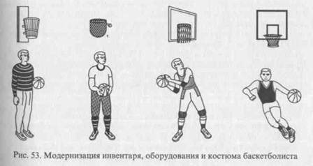 Дальнейшее развитие игры повлекло за собой изменение правил, инвентаря, оборудования и костюма баскетболиста (рис. 53). к В 1893 г. впервые появились железные кольца с сеткой. В 1894 г. окружность мяча был увеличена до 30-32 дюймов (76,2-81,3 см). ■