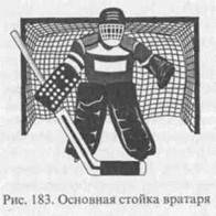 Техника игры вратаря. Основная стойка вратаря В ходе игры вратарь преимущественно находится в основной стойке (рис. 183). Она обеспечивает хорошую устойчивость и готовность вратаря к защите ворот и позволяет ему свободно перемещаться в различных направлениях. Основная стойка характеризуется следующими положениями звеньев тела: ноги слегка расставлены, согнуты в коленях, стопа несколько развернута носками наружу, туловище наклонено вперед так, что проекция плеч находится на уровне колена, голова чуть подана вперед и держится прямо, центр масс тела приходится на середину лезвия коньков. Клюшку вратарь держит более сильной рукой в том месте, где нижняя плоская часть переходит в рукоятку, при этом крюк клюшки всей нижней плоскостью касается льда перед коньками. Рука с ловушкой несколько согнута в локтевом суставе и опущена вниз ладонью вперед. Мышцы плечевого пояса расслаблены. В зависимости от игровой ситуации вратарь несколько изменяет основную стойку на более низкую или более высокую. Своевременный и рациональный выбор позиции вратарем зависит от техники его передвижения на коньках. Существует несколько основных способов передвижения: приставными шагами, выпадами со скольжением, спиной вперед, торможения. Приставными шагами вратарь перемещается на небольшое рас-
