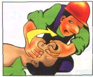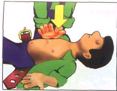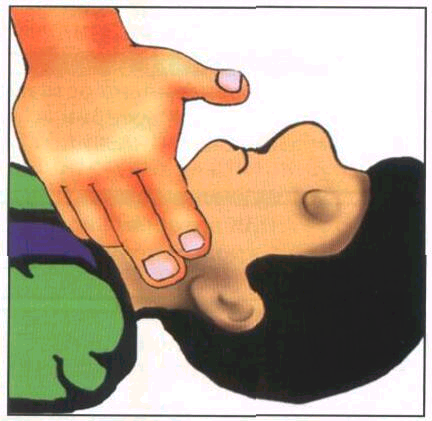 РАСПОЛАГАТЬ ЛАДОНЬ НА ГРУДИ ТАК, ЧТОБЫ БОЛЬШОЙ ПАЛЕЦ БЫЛ НАПРАВЛЕН НА СПАСАТЕЛЯ