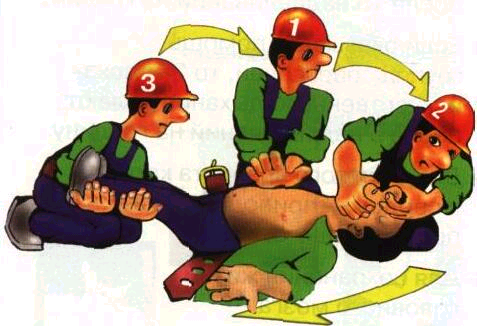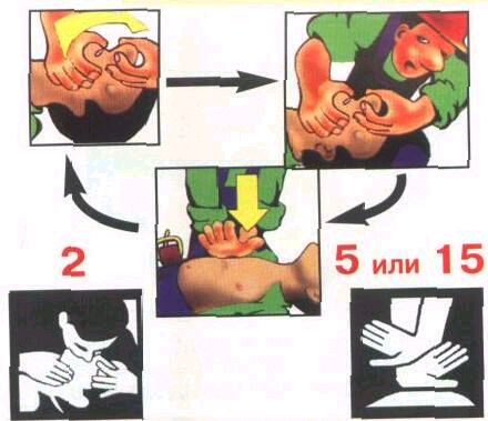 - Если оказывает помощь группа спасателей, то 2 «вдоха» искусственного дыхания делают после 5 надавливаний на грудину.