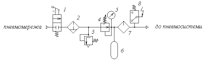 Рис. 7. Блок підготовки повітря: 1- пневморозподілювач під’єднання пневмосистеми до пневмомережі; 2 - фiльтр з вологовiддiлювачем; 3 - запобіжний клапан; 4 - редукційний клапан (регулятор тиску, редуктор); 5 - манометр; 6 - ресивер; 7 - мастилорозпилювач; 8 - реле тиску.