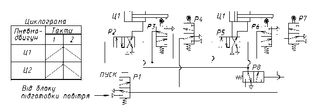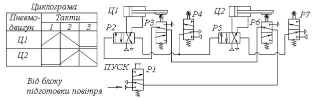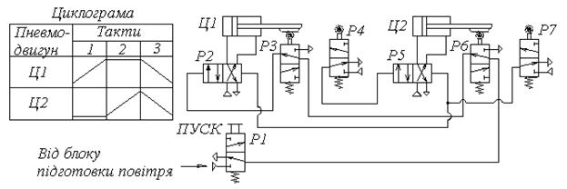 Принципова схема відпрацьовується у наступній послідовності: - запуск циклу здійснюється пусковим розподілювачем Р1; - розподілювачі Р3 і Р6 пропустять стиснуте повітря до розподілювача Р1 лише при дії на їх важелі штоків циліндрів у лівому (вихідному) положенні; - прямий хід циліндра Ц1 відбудеться при переключені розподілювача Р2; - розподілювач Р4 після завершення прямого ходу циліндром Ц1 пропустить стиснуте повітря до розподілювачів Р2 і Р5, які перемкнуться i здійсниться зворотний хід пневмоцилiндра Ц1 та прямий Ц2; - розподілювач Р7 після завершення прямого ходу циліндра Ц2 пропустить повітря до розподілювача Р5, переключення якого забезпечить зворотний хід циліндра Ц2; - цикл повторється.