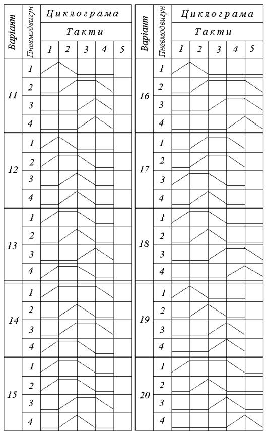8. Вибір варіанту контрольної роботи Номерваріанту завдання на контрольну роботу видається викладачем і складається з номеру варіанту та номеру схеми циклограми роботи пневмоприводу. За першою групою цифр вибираються з табл. 1 типи пневмодвигунiв, схеми регулювання швидкості пневмоприводу (задається в дужках) та дані для їх розрахунку, за другою - циклограма роботи з табл. 2.