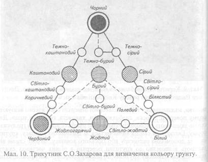 При визначенні кольору грунту використовують дещо спрощену таблицю кольорів І.С.Міхайлова або трикутник С.О.Захарова (мал. 10): чорний, темно-сірий, сірий, світло-сірий, белесувато-сірий, темно- бурувато-сірий, світло-бурувато-сірий, коричнювато-сірий, темно- коричнювато-сірий, світло-коричнювато-сірий, бурий, чорно-бурий, темно-бурий, сірувато-бурий, темно-сірувато-бурий і т. д.