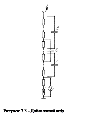 Вимірювання високих напруг здійснюють за допомогою масштабних перетворювачів у вигляді добавочних резисторів і дільників напруги. Добавочний резистор з відомим опором включають послідовно з вимірювальним приладом. Цей метод достатньо простий і широко використовується для розширення меж вимірювання вольтметрів до кількох кіловольт. При вимірюванні більш високих напруг паралельно до вимірювального приладу і частини вимірювального резистора зазвичай вмикають розрядник, що захищає прилад від перенапруг. Для вирівнювання розподілу потенціалу на резисторі при перехідних процесах і зниження його постійної часу між окремими секціями добавочного резистора вмикають конденсатори (рис. 7.3).