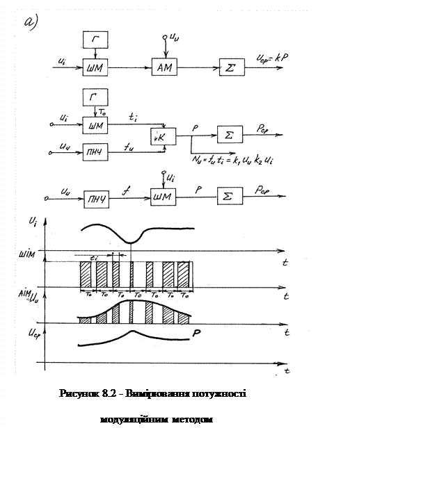 На рис. 8.2, а, в показано структурні схеми ватметрів, що базуються на методах ШІМ–АМ та ШІМ–ЧМ, а рис. 8.2, б пояснює принцип ШІМ і АМ. При використанні принципу ШІМ–АМ в широтному модуляторі ШМ (рис. 8.2, а, б) вхідним сигналом ui модулюється тривалість (ширина) t імпульсів, що надходять від генератора Г з частотою f 0=1/ T 0. З виходу ШМ імпульси тривалістю ti = k∙ui подаються до амплітудного модулятора АМ, де вони модулюються по амплітуді сигналом uu(t). При Т0 → 0 площа кожного імпульсу на виході АМ пропорційна до миттєвої потужності