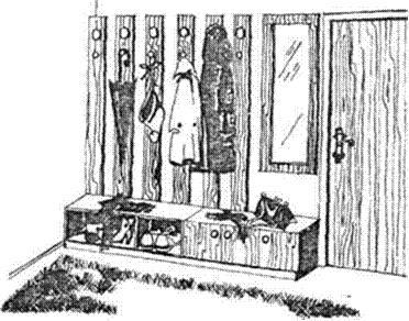 Особую группу составляют прихожие, в оформлении которых использованы элементы традиционной народной архитектуры и дизайна. В этом случае дверцы шкафов можно декорировать накладными филенками, расписывать, повторяя мотивы сундуков-скрынь. Интересный эффект дает использование природных материалов, если закрепить на стене натуральную циновку, а в качестве крючков использовать сучки или корневища. Очень мягкое, нейтральное решение можно получить, если интерьер дополнить коричневым или бежевым пятном (эту роль может взять на себя тканевый чехол на табурете). Плоское панно или объемная композиция из засушенных растений будет хорошо смотреться на ярком синем, алом, фиолетовом фонах, образованных тканью на стене, чехлах, тканевой обвязкой зеркала и т. п. При индивидуальном строительстве и возможности увеличить площадь прихожей может оказаться удобным островное положение шкафа-вешалки. Круглая в плане конструкция позволяет разместить все необходимые элементы оборудования прихожей. Зонты можно хранить в собранном виде в подчеркнуто декоративных кассетах из проволоки, дерева, керамики, которые контрастируют с материалом стен. Подставкой для зонтов может быть цилиндр из картона или фанеры, обтянутый материалом стен — обоями, тканью, полихлорвиниловой пленкой и т. п., который зрительно объединяется и растворяется на фоне стены. В прихожей необходимо и приспособление для сушки зонтов в развернутом виде. Самое простое решение — закрепить под потолком горизонтальную штангу с передвижными кольцами или крючками в зависимости от конструкции ручки зонта. В узкой прихожей штангу можно закрепить враспор между стенами, в квадратной — в углу, где она будет опираться на две смежные стены. Для хранения сменной обуви каждому под силу смастерить Кассеты из проволоки, ящики с выдвижными или распашными Дверцами. Интересным решением является устройство антресольных шкапов с доступом к ним через подъемный планшет в потолке. Этот прием позволяет использовать все пространство над подвесным потолком по всей площади прихожей. Доступ в пространство антресолей может осуществляться и через откидывающиеся дверцы люков. Очень часто приходится дооборудовать прихожую для хранения в ней негабаритных предметов (например, лыж). В зависимости от габаритов прихожей и конструкции встроенного шкафа их можно размещать горизонтально или вертикально. При наличии ниши или вертикальной секции встроенного шкафа лыжи вводятся в приготовленные для них пазы и фиксируются поворотной планкой. Их можно вставлять в специальные гнезда обув, ной секции и фиксировать колышками открыто на стене прихожей или в узких вертикальных шкафах.