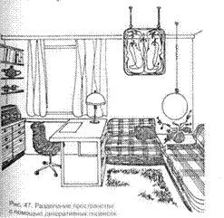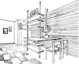 В современной практике проектирования интерьера в домах с достаточной высотой этажей все чаще встречается устройство спального места на антресольном уровне. В этом случае над рабочим местом или местом отдыха устраивают настил по балкам с приставной лестницей. Край антресоли загораживают защитным экраном либо оформляют достаточно массивными кашпо с зеленью или шкафными полками. Роль сервировочной плоскости и полок для хранения столовой посуды может взять на себя стеллаж (рис. 4.2.2), выделяющий обеденное место из пространства общей комнаты.