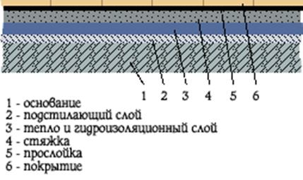 Конструкция пола включает в себя следующие элементы (см. рисунок 8.1.1): покрытие, прослойку, стяжку, тепло- и гидроизоляционный слой, подстилающий слой, основание. Покрытие - это самая верхняя часть пола, которая принимает на себя все эксплуатационные воздействия. В зависимости от используемых материалов, покрытия подразделяются на следующие виды: монолитные (сплошные), рулонные, листовые и из штучных материалов. Прослойка - это промежуточный слой, который связывает верхнюю часть пола (покрытие) с нижележащим элементом или перекрытием, а также может играть роль упругой постели для покрытия. По функциональному назначению прослойки можно разделить на две группы: · слой, связывающий покрытие с нижележащим элементом за счет сил сцепления, в состав которого входят смеси (мастики, растворы, бетоны, замазки) на вяжущих (цементе, битумах, полимерных смолах, жидком стекле); · слой, выступающий в роли упругой и ровной постели для покрытия, благодаря которой нагрузка на несущие элементы пола распределяется равномерно; в качестве материала для этой прослойки обычно используют песок. Стяжка - это слой, выравнивающий поверхность пола или перекрытия, а также служащий для создания ровной поверхности с необходимым уклоном для покрытия. В зависимости от используемых материалов, стяжки делятся на: сплошные (монолитные) и сборные. В состав сплошных стяжек входят: цементно-песчаные растворы, бетоны, керамзитобетоны, гипсобетоны и цементный фибролит. В технологиях полов со сборными стяжками в основном используют: плиты ДВП, ДСП, гипсоволкнистые листы и фанеру. Гидроизоляционный слой - это элемент пола, предназначенный для защиты от проникновения снизу сточных вод и других жидкостей, в том числе агрессивных, или для защиты от капиллярного поднятия грунтовых вод (для полов, расположенных на грунтовом основании). В первом случае используют рулонные или листовые материалы (изол, толь-кожу, гидроизол, полиизобутилен), во втором - слой щебня, пропитанный битумом или дёгтем (наливная гидроизоляция пола) или асфальтобетон, дёгтебетон (гидроизоляция асфальтового типа). Подстилающий слой (подготовка) - это элемент пола на грунте, распределяющий нагрузки по основанию и являющийся основным несущим элементом. Грунтовые основания не служат опорой всей конструкции пола, расположенного на грунте. Толщина подстилающего слоя определяется расчётным методом, в котором учитываются эксплуатационные нагрузки, которые будет нести пол, а также нагрузки в строительно-монтажный период. Эти условия влияют и на вид используемых материалов для подстилающего слоя. По виду материалов, используемых для устройства, подстилающие слои делятся на жёсткие и нежёсткие. Для первого вида - это цементный или кислотоупорный бетон (если присутствует воздействие на пол кислот), для второго вида - песок, шлак, щебень, гравий, глинобетон, булыжный камень. Популярные виды напольных покрытий · линолеум · ковролин · ламинат · штучный паркет · паркетная доска; пробковый пол