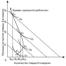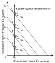 Рис. 9.3. Кривая «доход-потребление» на нейтральные товары Нейтральные, или независимые, блага – это блага, которые не являются ни нормальными, ни некачественными для потребителя. Это блага, потребление которых остается неизменным при всех уровнях дохода. К этой группе благ относят, например, соль, туалетную бумагу, зубную пасту и т. п., расходы на которые занимают относительно незначительную часть бюджета. Это блага первой необходимости.
