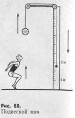 5. Ребристый щит для развития быстроты реакции и совершенствования ловли мяча. 6. Подвесной мяч (рис. 80), используемый для развития прыгучести, прыжковой выносливости, силы пальцев (если мяч прочно закреплен и может выдержать вес игрока, захватывающего его двумя руками). 7. «Заглушка», накрывающая кольцо. Она может быть деревянной, металлической или пластмассовой. Наружная часть ее сферическая. Более сложная «заглушка» представляет собой диск меньшего размера, чем диаметр кольца, который прикрепляют к кольцу на амортизаторах, или специальное пневматическое устройство. Мяч, ударившись о такую «заглушку», выбрасывается из кольца. Глава IV. ВОЛЕЙБОЛ