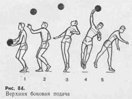 При двойных шагах движение начинает стоящая сзади нога. Скачок выполняют поочередным активным отталкиванием ног. Подача мяча. Подача применяется не только с целью введения мяча в игру, но и как средство атаки — выигрыша очка или срыва запланированных комбинаций соперника. Различают подачи нижние и верхние (прямые и боковые). При выполнении каждой из них решаются определенные тактические задачи: одни более нацеленные, другие преимущественно силовые, третьи — планирующие. Нацеленные подачи применяют в тех случаях, когда мяч надо направить в уязвимое место площадки или на игрока, принимающего мяч слабее других. С этой целью используют верхнюю прямую, а также нижнюю прямую и боковую подачи. Силовые подачи выполняют, чтобы затруднить прием мяча. Эти задачи решают преимущественно верхней боковой или прямой подачей.