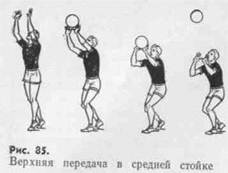 ши — левую) выставить на полшага вперед.~Мяч подбрасывают вверх левой рукой. Правая рука, согнутая в локте, подготавливается к замаху. Перед ударом игрок сгибает опорную (правую) ногу, отклоняя туловище назад. В момент удара разгибает правую ногу, выпрямляет руку и туловище. Удар осуществляют внутренней частью сжатой ладони. Верхние прямые подачи могут быть выполнены различными способами. Например, не сильным, но точным ударом, что достигается укороченной амплитудой замаха с небольшим отклонением туловища назад и коротким нацеленным ударом по мячу или сильным ударом с большим замахом, с более энергичным сгибанием и разгибанием правой ноги и туловища (рис. 83). Верхняя боковая подача сложна по технике выполнения, но эффективна. Игрок становится боком к сетке и подбрасывает мяч левой рукой на 150—180 см. Правой рукой он делает замах вниз-назад, наклоняет туловище в сторону замаха и центр тяжести переносит на правую ногу. При снижении мяча одновременно выпрямляет ноги и туловище и начинает движение рукой по дуге вперед-вверх к мячу, чтобы выполнить удар в высшей точке. Сила удара увеличивается резким выпрямлением ног и движением туловища в сторону удара, движение руки ускоряется с приближением к мячу. Скорость полета мяча при верхней боковой подаче выше, чем во всех других способах. Прием мяча, летящего от боковой подачи, еще торые выполняют кончиками пальцев, направленных вверх; к нижним — предплечьями соединенных рук или сомкнутыми кистями. Поскольку передачи выполняют из различных исходных положений, их подразделяют на подгруппы. К группе верхних передач относят передачи в стойках (в опорном положении), в прыжке, с отвлекающими действиями, в падении, назад за голову. К группе нижних передач относят передачи двумя руками, одной рукой и передачи с падением. Верхняя передача мяча в стойках. В средней стойке игрок, ожидающий мяч, сгибает ноги в коленях, выставив одну ногу вперед, вес тела слегка переносит вперед, руки сгибает в локтях. При соприкосновении пальцев с мячом на уровне глаз он последовательно выпрямляет ноги, туловище и руки, посылая мяч в нужном направлении конечным движением кистей и пальцев (рис. 85). В низкой стойке передачи выполняют на более согнутых ногах, амплитуда движений ног, рук и туловища короче, руки встречают мяч чуть ниже подбородка. В высокой стойке передачи осуществляют на незначительно согнутых ногах, руки встречают мяч на уровне лба. Выбор стойки определяется траекторией и скоростью полета мяча: чем ниже траектория и больше скорость, тем ниже стойка для приема, мяча.