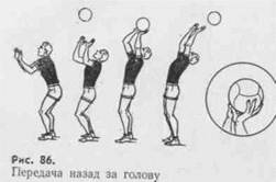 Верхняя передача в прыжке может выполняться с небольшого разбега (1—2 шага) и с места. Ее применяют в основном при нападающих действиях, чтобы дезориентировать соперника в постановке блока. Движения рук и туловища при передаче отличаются короткой амплитудой. В момент отталкивания от опоры игрок поднимает предплечья выше головы. Кисти встречают мяч в более горизонтальном положении, чем обычно. Эта особенность ярче выражена при выполнении передачи мяча назад за голову. Туловище и голову в прыжке слегка отклоняют назад. Часто передача в прыжке сочетается с имитацией нападающего удара: игрок делает разбег, прыжок и замах для удара, но в последний момент передает мяч партнеру. Такой прием называется откидкой и относится к скрытым передачам. Разновидностью скрытых передач являются передачи назад за голову (рис. 86). Верхняя передача в падении применяется чаще как вынужденный выход из положения, когда игрок явно опаздывает к мячу, но принимает его сверху. В заключительной фазе передачи он не может сохранить вертикальное положение, поэтому падает с перекатом на бедро, спину. Техника приема состоит в том, что после быстрого перемещения вперед-в сторону, навстречу летящему мячу, спортсмен делает глубокий выпад. Одновременно он наклоняет туловище над опорной ногой и начинает разворачиваться в сторону передачи (рис. 87). Выполнив передачу активнымдвижением предплечий и кистей, игрок мягко перекатывается на бедро и спину, а затем быстро встает. Иногда очень низкий мяч принимают способом сверху в падении и с перекатом на спину. В этих случаях игрок из низкой стойки опускается еще ниже, выполняет передачу вперед-вверх и тут же перекат на спину с наклоном головы вперед. Здесь важно, чтобы спортсмен своевременно вышел под мяч. Нижние передачи. Техника выполнения их следующая. После перемещения к мячу игрок делает глубокий выпад и одновременно выставляет руки под мяч. Руки при этом выпрямлены и напряжены, кисти сомкнуты, отведены вниз. Мяч принимают на соединенные вместе предплечья, развернутые наружу. При приеме летящего мяча, посланного сильным ударом, передачу выполняют без замаха, сведенные руки подставляют под мяч. Перед приемом летящего мяча, направленного слабым ударом, руками делают встречное движение, а в момент удара руки сопровождают его полет (рис. 88). Мячи, сильно летящие в стороне от игрока или далеко от него, часто передают одной рукой. Нижняя передача в падении с перекатом на спи. н у чаще выполняется одной рукой, когда мяч летит в стороне от игрока. Она сходна с верхней передачей в падении. Основное ее отличие — в движениях рук. Все движения выполняют быстро. Одновременно с выпадом для приема мяча выносят одноименную руку. Рука при этом прямая; удар осуществляют коротким, отрывистым движением предплечья или кулака. После удара игрок мягко падает, выполняет перекат. Нижняя передача в падении на руки с перекатом на грудь применяется в тех случаях, когда мяч летит очень низко, сильно и далеко от игрока. Подбегая к мячу, игрок на последнем шаге переносит вес тела на выставленную вперед согнутую ногу. Туловище сильно наклоняет вперед, руки опускает вниз и отводит назад для замаха. Выставленная вперед левая нога (рис. 89) осуществляет отталкивание от опоры. Находясь в безопорном положении, игрок выполняет удар открытой ладонью правой 