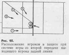Система защиты со второй передачи игрока передней линии *. При организации ее игрок зоны 6 выдвигается вперед. Расположение других игроков зависит от того, из какой зоны готовится удар. Если атака осуществляется из зоны 4 и на блок выходят игроки зоны 2 и 3, то игрок 6 страхует непосредственно сзади блокирующих в зоне 2 (рис. 97). При атаках из зоны 2 в блоке участвуют игроки 3 и 4. Игрок зоны 6 перемещается влево за блокирующих. И в том и в другом случае в защите участвуют в основном два игрока зон 1 и 4. Игрок, свободный от блока (в первом случае — 4, во втором — 2), должен оттягиваться назад для страховки своей зоны и приема мячей с косых ударов. Недостаток этой системы защиты в том, что зона 6 оказывается слишком открытой. Если нападающие соперника высокорослые игроки, умеющие высоко прыгать и на- падать поверх олока, то оооронять эту зону сложно. Если же к защите подключается игрок, свободный от блока, то