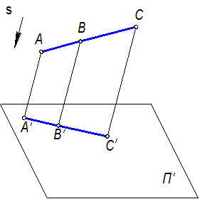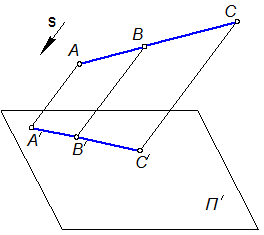 Отсюда следует, что отношение, в котором точка В делит отрезок АС. сохраняется в проекции для точки В′, делящей отрезок А'С′.