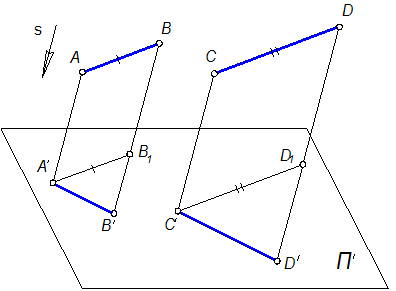 Рисунок 1.2.3 – Параллельная проекция параллельных в пространстве прямых Построив для прямых АВ и CD проецирующие плоскости AА¢В¢B и CС¢D¢D, заметим, что эти плоскости параллельны, как плоскости, имеющие углы с соответственно параллельными сторонами (AB||CD; BВ¢ ||DD¢). Поэтому проецирующие плоскости пересекают плоскость проекций П' по двум параллельным между собой прямым. 2) Отношение отрезков, лежащих на параллельных прямых, сохраняется в параллельной проекции. Пусть АВ и CD – отрезки, лежащие на параллельных прямых. Построим их проекции на плоскость П¢ при направлении проецирования s (рисунок 1.2.3). Проведём в проецирующих плоскостях отрезки А¢В1 и С¢D1, соответственно параллельные и равные отрезкам АВ и СD. Треугольники А¢B¢B1 и С¢D¢D1 являются подобными, т.к. их соответственные стороны параллельны. Отсюда