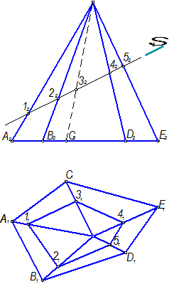 Рисунок 1.3.49 – Пересечение гранной поверхности с плоскостью Следует заметить, что вершинами многоугольника сечения являются точки пересечения секущей плоскости с рёбрами многогранника в собственном смысле. Это значит, что точки пересечения секущей плоскости с продолжением рёбер не могут являться вершинами многоугольника сечения как не принадлежащие поверхности многогранника, но могут быть использованы для удобства построения. Аналогично, сторонами многоугольника сечения могут являться только те отрезки прямых, которые принадлежат граням в собственном смысле. В данном примере пирамида пересекается с фронтально проецирующей плоскостью S (S1). Решение получается простым, поскольку фронтальная проекция сечения вырождается в отрезок прямой линии, совпадающей с фронтальным следом плоскости S. Горизонтальной проекцией сечения является пятиугольник с вершинами 11, 21, 41, 51, 31.