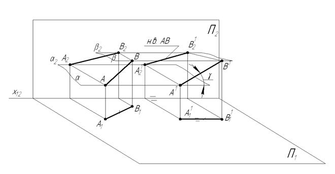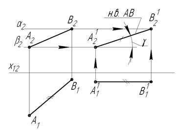 Рассмотрим примеры преобразования чертежа способом плоскопараллельного перемещения при графическом решении четырех основных задач. Задача №1. Преобразовать прямую общего положения во фронтальную прямую уровня (рисунок 1.4.9). Решение. Выполним плоско-параллельное перемещение прямой АВ относительно фронтальной плоскости проекций. Для того, чтобы прямая стала параллельной П2, горизонтальную проекцию (АВ) А1В1 переместим в свободное место чертежа и расположим параллельно оси х. При этом длина отрезка А1В1=А11В11. Фронтальные проекции точек АВ (А1В1) перемещаются соответственно по прямым α2, β2 – фронтальным проекциям горизонтальных плоскостей уровня α и β, в которых перемещаются точки А и В. Затем перпендикулярно оси х из проекций точек А11 и В11 проведем линии связи. Из проекций А2 и В2 параллельно оси х проведем линии связи до пересечения с соответствующими линиями связи в соответствии с рисунком 1.4.9. В результате построения определяется натуральная величина АВ и угол γ его наклона к горизонтальной плоскости проекций.