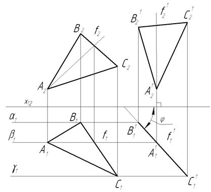 Задача №3. Преобразовать плоскость общего положения во фронтально проецирующую плоскость (Рисунок 1.4.11). Решение. Плоскость задана треугольником ABC. В плоскости треугольника предварительно построим фронталь f(f1,f2). Заметим, если плоскость преобразуется в горизонтально проецирующую, то в плоскости проводиться горизонталь h. Треугольник плоскопараллельно перемещаем таким образом, чтобы фронталь треугольника располагалась перпендикулярно горизонтальной плоскости проекций, то сама фронталь на эту плоскость проецируется в точку, а плоскость треугольника – в прямую, т.е. плоскость треугольника ABC станет горизонтально проецирующей. Поэтому в свободном месте чертежа фронтальную проекцию Δ ABC(A2B2C2) расположим так, чтобы фронтальная проекция фронтали (f2) располагалась перпендикулярно оси х. При этом фронтальные проекции треугольника не изменили своей формы (A2B2C2= A21B21C21), а горизонтальные проекции вершин Δ ABC(A1B1C1) переместились по прямым α1, β1, γ1 – горизонтальным проекциям фронтальных плоскостей уровня, проведенных через эти вершины. Фронтальная проекция Δ ABC (A11B11C11) будет представлять собой отрезок прямой, т.е. плоскость треугольника станет горизонтально проецирующей. При помощи этой задачи также определяется натуральная величина угла наклона φ плоскости Δ ABC к фронтальной плоскости проекций (рисунок 1.4.11).