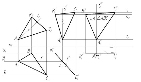 Задача №4. Преобразовать плоскость общего положения во фронтальную плоскость уровня (рисунок 1.4.12). Решение. Для решения этой задачи необходимо выполнить два преобразования: сначала преобразовать плоскость треугольника во фронтально проецирующую плоскость (смотри задачу №3), а затем преобразовать Δ ABC, чтобы он находился во фронтальной плоскости уровня. Для этого на свободном месте чертежа расположим горизонтальную проекцию Δ ABC(A11B11C11) параллельно оси х. При этом A1B1C1 = A11B11C11, а фронтальные проекции вершин треугольника будут перемещаться по соответствующим плоскостям уровня – λ2, κ2, τ2. Так как преобразованный треугольник лежит в плоскости уровня, следовательно, его фронтальная проекция после последнего преобразования, будет являться натуральной величиной Δ ABC.