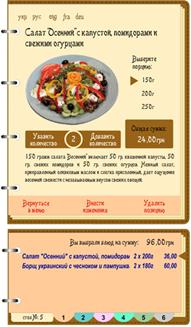 Однією із основних вимог сучасної індустрії ресторанного бізнесу є швидке і якісне обслуговування споживачів. Такі можливості реалізовані в системі інтерактивного електронного меню (eMenu). Цей новітній засіб комунікації є потужним інструментом, що дозволяє надавати клієнтам високий рівень обслуговування, а також більш ефективно керувати закладом. Електронне меню повністю замінює традиційне меню і пропонує цілий ряд додаткових функцій. Воно є не тільки каталогом продукції, яку пропонує заклад, але і прискорює процес обслуговування, виключає людський фактор (помилки) під час приймання замовлення. Меню представлене у вигляді візуально дуже схожому на паперовий прототип, що сприяє легкому сприйняттю інтерфейсу. Багатомовна підтримка поширюється не тільки на зміст меню, але і всі службові тексти інтерфейсу. Мови тексту перемикаються в будь-який момент роботи з меню, кількість мов не обмежена. Для відвідувачів переваги використання eMenu є наступними: - зручність замовлення, швидка і легка навігація по меню, пошук страв; - меню є максимально інформативним: подаються описання і фото страв, інгредієнти, способи і строки приготування; - по стравах автоматично пропонуються доповнення і добавки: гарніри, соуси і т. п.; - наявність можливості швидкого виклику офіціанта і запиту рахунку; - можливість доступу до Інтернету без використання власної комп’ютерної техніки; - наявність доступу до великої кількості додаткових розважальних сервісів (ігор, музики, відео та інше); - зручна форма зворотного зв’язку про якість обслуговування; Використання електронного меню є достатньо корисним і для закладу ресторанного господарства. Зокрема, воно дозволяє: Можливим також є використання варіанту електронного меню з голосовим супроводом. За допомогою дотику до сенсорного екрану відвідувач може активізувати зображення страви, що його цікавить, почути розповідь про назву страви, його вартість, рецептуру, історію страви, калорійність і дізнатись про напої, що рекомендуються до неї. Існує декілька можливих варіантів виконання і використання eMenu. Найбільш поширеними є електронні меню на базі стаціонарних моноблоків, закріплених на краю столу, або поряд з ним. Набуває популярності варіант електронного меню (рис. 55) на основі ультратонких сенсорних планшетів і безпровідного зв’язку. Розмір такого мобільного меню сягає формату листка А4, воно має товщину до 1,5 см и вагу до 900 г. Екран меню виконаний розміром 10" і має розрішення 1024 х 600 точок. Повністю заряджений пристрій може працювати без додаткової підзарядки протягом 3-х годин, що цілком достатньо для виконання своєї функції. Таке меню може подаватися кожному гостю за столом окремо чи по одному на декількох відвідувачів. Інноваційним варіантом застосування електронного меню є їх використання вбудованими в поверхню столу (в центрі) або барну стійку. При цьому використовується широкоформатний антивандальний сенсорний екран, що реагує тільки на дотик пальців, та дозволяє при необхідності ставити на його поверхню посуд і столові прибори. Інтерфейс цього меню легко повертається одним дотиком до сенсорного екрану.