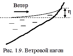 В зависимости от формы водоема возможны колебания основного тона и обертонов, когда на характерном размере водоема укладывается разное число полуволн. Например, в Финском заливе наблюдаются одно-, двух-, трех- и четырехузловые сейши. Подъем уровня воды в устье Невы за счет сейш в Финском заливе может достигать 100-150 см. Третья причина нагонного наводнения – ветровой нагон (рис. 1.9). Ветер повышает уровень воды у берега –