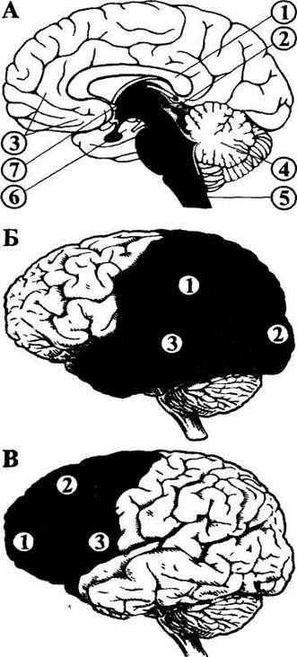 Рис. 4 А – ЭНЕРГЕТИЧЕСКИЙ – Первый блок регуляции общей и избирательной неспецифической активации мозга Б – ЗАДНИЙ МОЗГ – Второй блок приема, переработки и хранения экстероцептивной информации