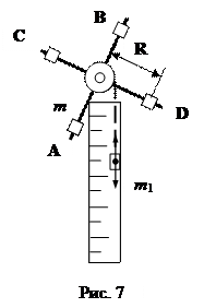 В работе используется крестообразный маятник Обербека (рис.7), который состоит из двух взаимно перпендикулярных стержней АВ и CD, ввинченных в шкив К. Крестовина может вращаться при падении груза Р, привязанного к нити, намотанной на шкив. По стержням АВ и CD могут перемещаться четыре груза, массы m которых одинаковы.