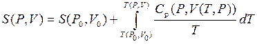 Таким образом, мы можем получить значение энтропии любого состояния (P, V) по отношению к первоначальному состоянию (P 0, V 0). Точная формула зависит от нашего выбора промежуточных состояний. Для примера, если первоначальное состояние имеет такое же давление, как и конечное состояние, то