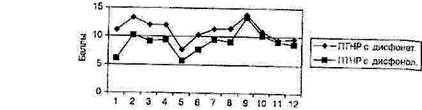 Рис. 28. Профиль структуры интеллекта по WISC в группах ПТНР с дисфонетической диспраксией и ПТНР с дисфонологической диспраксией В приведенной корреляционной плеяде обращает на себя внимание избирательность связей словаря и вербальных субтестов. Можно было бы предположить, что эта связь — лишь свидетельство негативного влияния дефицита номинативного словаря на вербальные интеллектуальные способности. Однако это, по-видимому, не так. Наиболее низкие результаты, достоверно отличающиеся от нормы, дети с моторной алалией показали в субтестах № 1, № 5 и № 6. Ни один из этих субтестов не коррелировал с номинативным словарем. Из данных корреляционного анализа можно сделать вывод, что дефицит номинативного словаря имеет связь (возможно, функциональную) с определенным вербальным интеллектуальным фактором, который оценивается субтестом «Понятливость». Данный субтест содержательно ориентирован на оценку знания социальных норм поведения в определенных типовых ситуациях, то есть в определенной степени характеризует социальную зрелость (иногда это качество называют «социальным интеллектом»). Существуют данные, позволяющие полагать, что подобные интеллектуальные способности имеют отношение к прагматике поведения (и речи) и связаны с правополушарными функциями (Деглин В. Л., 1995, Semrud-Clikeman M., Hynd С, 1990). С этим согласуется и тот факт, что в данном субтесте дети с моторной алалией показывают лучшие среди вербальных заданий результаты. По-видимому, данный вид связи имеет отношение к денотативному аспекту номинативной лексики. Показатели глагольной лексики не имели достоверных корреляций ни с одним субтестом. Это подтверждает точку зрения, что механизмы усвоения глаголов отличаются от механизмов формирования номинативной лексики (Касе-вич В. Б., 2001, Maratsos M., 1991, Tomasello M., KrugerC. A., 1992).
