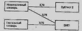 Рис 29. Корреляции результатов исследования словаря и интеллекта по ABM-WISC (субтест № 2 — «Понятливость», ВИП — Вербальный интеллектуальный показатель) удетей с моторной алалией Данные экспериментального исследования позволяют полагать, что когнитивные механизмы, оказывающие наиболее сильное влияние на формирование лексики, различаются в группе детей с моторной алалией и в группе с па-раалалическим ТНР. В первом случае не было получено значимых корреляций между лексическими характеристиками и невербальными интеллектуальными показателями. Своеобразие механизмов формирования номинативного и глагольного лексикона при разных формах недоразвития речи проявилось и в различии взаимосвязи речевых показателей между собой. Были вычислены коэффициенты корреляции между результатами выполнения задания «Подбор антонимов» (по 10 на существительные, прилагательные и глаголы) и показателями экспрессивного словаря существительных и глаголов (рис. 30, 31). Приведенные корреляционные плеяды демонстрируют два ряда фактов. Как видно из сравнения рисунков 30 и 31, характер внутрисистемных корреляционных связей разных языковых подсистем между собой различается в двух клинических группах детей с ТНР. Следовательно, структурная организация языковой системы удетей с АТНР и с ПТНР существенно различается. Это, в свою очередь, подтверждает принципиальный характер различий между данными формами недоразвития речи. Разные компоненты словаря являются относительно автономными компонентами лексикона как подсистемы языка, особенно в аспекте парадигматической организации. Это особенно отчетливо проявляется в заданиях на подбор антонимов. Их диссоциированность у детей с параалалической формой ТНР выражена в наибольшей степени. Избирательно высокая связь (практически — функциональная) между успешностью подбора антонимов и объемом словаря на одни и те же части речи у детей с моторной алалией доказывает ведущую роль объема лексики и ее парадигматической организации в выполнении этого задания. У детей с параалалической формой ТНР этого не наблюдалось. Возможно, у этих детей различная успешность в подборе антонимов в большей степени зависит от сформированности логических операций противопоставления. Логический аспект задания дифференцирует этих детей в большей степени, чем языковой. Антонимы