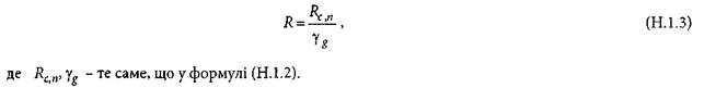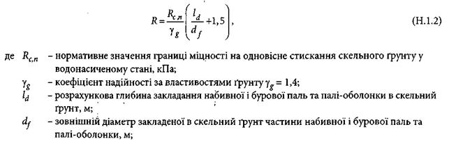 Н.1.2 Розрахунковий опір ґрунту R під нижнім кінцем палі-стояка, кПа, слід приймати: а) для всіх видів забивних паль, що спираються на скельні і малостисливі ґрунти, R = 20000 кПа; б) для набивних і бурових паль та паль-оболонок, що заповнюються бетоном і закладених у невивітрилий скельний ґрунт (без слабких прошарків) не менше ніж на 0,5 м, за формулою
