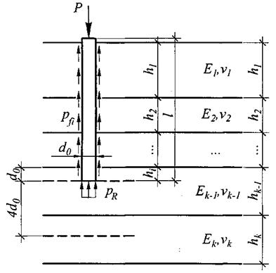 Рисунок П.1.1 – Розрахункова схема для визначення осідання вертикально навантаженої палі в ґрунтовій основі, що складена нашаруваннями ґрунтів, при вертикальному навантаженні