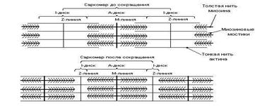 Амплитуда тетанического сокращения превышает амплитуду одиночного мышечного сокращения. Н. Е. Введенский объяснил это явление с точки зрения состояния возбудимости мышцы, введя понятие об оптимуме и пессимуме частоты раздражения. Оптимальной называется такая частота раздражения, при которой каждое последующее раздражение осуществляется в фазу повышенной возбудимости. Тетанус при этом будет максимальным по амплитуде - оптимальным. Пессимальной называется такая частота раздражения, при которой каждое последующее раздражение осуществляется в фазу пониженной возбудимости. Тетанус при этом будет минимальным по амплитуде - пессимальным. 6. Механизм мышечного сокращения. Мышцы состоят из мышечных волокон, которые состоят из множества тонких нитей - миофибрилл, расположенных продольно. Каждая миофибрилла состоит из протофибрилл - нитей сократительных белков актина и миозина. Перегородки, называемые z -пластинами, разделяют миофибриллы и, следовательно, мышечное волокно на участки - саркомеры. В центральной части каждого саркомера свободно расположены толстые нити миозина. На обоих концах саркомера находятся тонкие нити актина, прикрепленные к Z-пластинам. Нити миозина выглядят в световом микроскопе как светлая полоска (Н-зона) в темном диске, который дает двойное лучепреломление, т. к. содержит нити миозина и актина и называется анизотропным или А-диском. По обе стороны от А-диска находятся участки, которые содержат только тонкие нити актина и кажутся светлыми, т. к. они обладают одним лучепреломлением и называются изотропными или i -дисками. По их середине проходит темная линия - Z-мембрана. В соответствии с теорией скользящих нитей при сокращении тонкие актиновые нити скользят вдоль толстых миозиновых нитей, двигаясь между ними к середине саркомера. Сами актиновые и миозиновые нити своей длины не изменяют.