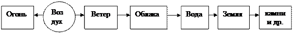 Приведенная точка зрения пока недостаточно обоснована и существует лишь в качестве научной гипотезы. Если будут найдены убедительные аргументы в ее пользу, то можно будет сказать, что материальный мир есть физическое поле, которое может существовать в различных состояниях – в виде света, радиоволн, газа, жидкости, твердого тела, галактики и т. д. Описанный подход к объяснению материи не является новым. Он встречается уже во взглядах древнегреческих материалистов. Например, Фалес (VII–VI вв. до н. э.) полагал, что основу всего материального мира составляет вода. Вода существует в жидком, твердом (лед) и газообразном (пар) состояниях. Наверное, есть и другие ее состояния, полагал Фалес. Огонь есть пар, только очень горячий, а камень есть более твердый, чем обычный лед, рассуждал он, сделав, в конечном счете, философский вывод: мир есть трансформированная в разные состояния вода. Чуть позднее примерно к такому же выводу пришел другой греческий философ – Анаксимен (VI в. до н. э.). Он полагал, что мир построен из такой субстанции, как воздух. «Воздух... если он разрежен, становится огнем, а если он сгущен, становится ветром, потом облаком и затем водой, потом землей, потом камнями, и остальное возникает из этого», – писал Анаксимен[112]. Эмпедокл (V в. до н. э.) и древнекитайские философы считали, что мир состоит из четырех первоэлементов: воды, огня, воздуха и земли. Все многообразие мира объяснялось ими различными сочетаниями этих элементов. Это древнее материалистическое представление мира в его анаксименовском варианте наглядно можно изобразить следующим образом: