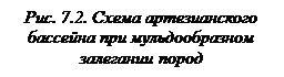 К напорным (артезианским) водам относятся подземные воды, находящиеся в водоносных горизонтах, перекрытых и подстилаемых водоупорными (или относительно водоупорными) слоями горных пород, и обладающие гидростатическим напором. Они располагаются на больших простран-ствах и глубинах вне сферы воздействия местных дрен (рек, оврагов и др.). Артезианские межпластовые напорные воды названы по месту их первоначального нахождения в XII в. во французской провинции Артуа (древнее название Артезия). Водоносные горизонты, содержащие напорные межпластовые воды, связаны с различными главным образом отрицательными структурами земной коры: синеклизами, мульдами, предгорными и межгорными прогибами и моноклиналями (греч. "моно" - один, "клино" - склоняю). По условиям залегания пород, содержащих артезианские воды, выделяются артезианские бассейны и артезианские склоны. Под артезианскими бассейнами понимают совокупность артезианских водоносных горизонтов, залегающих в синеклизах и других прогибах. В каждом артезианском бассейне (рис. 7.2) выделяются: а) область питания - площади выхода на дневную поверхность водоносных пород, располагающихся на наивысших гипсометрических отметках; б) область разгрузки - места выхода на поверхность водоносного горизонта на более низких абсолютных отметках по сравнению с областью питания.