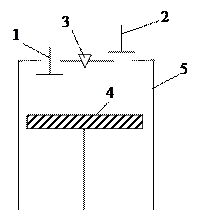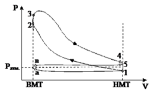 5- циліндр. а-1—ізобарний впуск паливно-повітряної суміші через відкритий впускний клапан 1 в циліндр, в тому числі за рахунок тиску Ратм.. При цьому поршень рухається із ВМТ до НМТ; 1-2—політропний стиск паливно-повітряної суміші до досягнення температури нижчої від температури самозаймання палива. Ця умова накладає межу верхнього тиску; 2-3—ізохорне (миттєве) згоряння паливно-повітряної суміші від електричної свічки; 3-4—політропне розширення продуктів згоряння (поршень рухається із ВМТ у НМТ)—робочий хід; 4-5—ізохорний майже миттєвий відвід теплоти 5-в—повне ізобарне очищення циліндра від продуктів згоряння при русі поршня з НМТ у ВМТ і відкритому клапані 2; в-а—ізохорне закриття клапана 2 і відкриття клапана 1. .