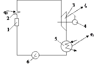 1-2—ізобарно-ізотермічний відвід теплоти від відпрацьованої пари в конденсаторі 5. В точці 1—пара на лінії насичення, в точці 2 вода на лінії насичення. 2-3—ізохорне підвищення тиску води в сітковому насосі 6. 3-4—підігрів води в теплогенераторі до стану її насичення. 4-5—ізобарно-ізотермічний підвід теплоти до води з метою перетворити її в пару. 5-6—відвід теплоти в пароперегрівачі для отримання сухої перегрітої пари з високою температурою і тиском в точці 6. 6-1—адіабатне розширення пари в паровій турбіні 3. Після виходу із турбіни волога насичена пара з тиском приблизно 5 КПа і температурою приблизно 50°С поступає в конденсатор. Ефективність роботи ПСУ визначається з рівняння