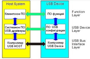 USB системы являются многослойными Слой Bus Interface (Интерфейс шины) обеспечивает физическую, сигнальную, и пакетную связь между хостом и устройствами, обеспечивая передачу данных между хостом и устройствами. Слой Device (устройство) используется системным ПО для базовых USB-операций с устройстовом посредством шины. Это позволяет хосту определить характеристики устройства, включая класс устройства, имя производителя, имя устройства, требования к напряжению и многие другие функции наподобие скорости устройства и уровня поддержки USB. Слой Function (Функция) предоставляет дополнительные возможности, специфичные для устройства. Соответствие слоев хоста и ПО устройства позволяет выполнять функции, присущие устройству.