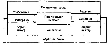 В соответствии с этой моделью механизм функционирования политической системы включает четыре фазы. Во-первых, это 'вход (input)', воздействие внешней среды (социальной и внесоциальной, природной) на политическую систему в форме требований и поддержки. Например, это может быть требование населения снизить подоходный налог при одновременной легитимной поддержке деятельности правительства в целом. Во-вторых, 'конверсия' (или преобразование) социальных требований в подготовку альтернативных решений, являющихся определенным реагированием правительства. В-третьих, это 'выход (output)', принятие решений и их реализация в форме практических акций. И наконец, в-четвертых, результаты деятельности правительства влияют на внешнюю среду через 'петлю обратной связи' (feedback loop). Политическая система является 'открытой системой', получающей постоянные импульсы от окружающей среды. Ее основной целью являются выживание и сохранение устойчивости системы посредством адаптации и приспособления к среде. В основе этого механизма лежит принцип 'гомеостатического равновесия', согласно которому политическая система для поддержания внутренней стабильности должна постоянно реагировать на нарушение её баланса со внешней средой. Несмотря на сильную критику системного подхода в конце 1960-начале 1970-х гг. Д. Истон в своей новой работе 'Анализ политической структуры' (1990) продолжает концептуальную разработку своей модели путем изучения внутренней структуры 'черного ящика', то есть политической системы, опираясь на критический анализ неомарксистского структурализма Н. Пуланзаса. 'Политическая структура подобна невидимой силе, царящей в глубине политической системы'10,- начинает свое исследование Д. Истон. Вообще различные политические структуры, по его мнению, образуются из таких элементов, как государственные органы, партии и групповые объединения, элитные группы и массовидные силы, а также из играемых всеми ими политических ролей. Сама же 'политическая структура' выступает как атрибутивная характеристика политики, которая обуславливает ограничения в поведении индивидов и групп, так же как одновременно может и способствовать достижению их целей. Истон выделяет различные типы политических структур, составляющих 'начинку' политической системы: высокоорганизованных и низкоорганизованных, формальных и неформальных, режимных и дифференцированных институтов.