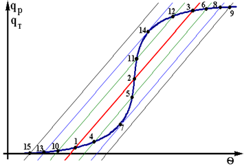 Стаціонарні режими,одержані при базовому значенні qвх, позначені цифрами 1,2,3. При збільшенні qвх лінія тепловідводу зміщується праворуч.При цьому число стаціонарних режимів залишається колишнiм (позначені 4,5,6). При подальшому збільшенні qвх число стаціонарних режимів спромагається змінитися. Для деякого значення qвх одержуємо тільки два стаціонарних режима – точки 7 та 8, причому стаціонарний режим в крапці 7 -нестійкій. При більш великих значеннях qвх лінія тепловідвода лежить нижче лінії тепловиділення практично у всієї області,за винятком високих значень q. В даному випадку має місце тільки один стаціонарний режим – точка 9. Аналогічна картина спостерігається і при зменшенні значення q. Розглянемо докладно стаціонарні режими в крапках 7 і 13.Малійша зміна температури приводить до того, що реактор практично миттєво переходить на високотемпературний режим (із точці 7 в точку 8 на верхньої ветвi графіку) або, навпаки, на спідкотемпературний режим (із точки 13 в точку 14 на нижньої ветвi). Аналіз роботи реактора слушно проводити з використанням статичних характеристік, що показують зміну вихідних величин (в даному випадку - q) в стаціонарному режимі при зміні параметрів на вході. Кількісною мірою зміни вихідних величин при зміні вхідних параметров служить параметрична чутливiсть - межа відношення зміни вихідної величини до відповідної зміни вхідной: