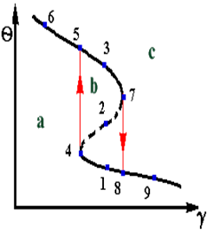При малих значеннях g існує єдиний високотемпературний режим - область а. По мірі збільшення g спостерігається перехід в область існування трьох режимів - область b. При великих значеннях g буде існувати єдиний нiзкотемпературний режим - область с. При певних значеннях параметра g можливі “зриви” із високотемпературного режиму на нiзкотемпературний – точка 13 і навпаки – точка 7.