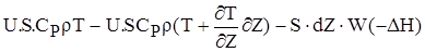 L - довжина реактора, м; Z - відстань від входу до вибранного шару висотою dz, м; S - перетин реактора,м2; U - швидкість струму (м/с); Q = U × S (м 3 /с)- об'ємний видаток; V = S×dz- обсяг виділеного елементарного шару,м3; Свх,Твх - концентрація і температура на вході в шар; C, Т - концентрація і температура на вході у виділений шар; W - швидкість хімічного перетворення; Рис 2.11